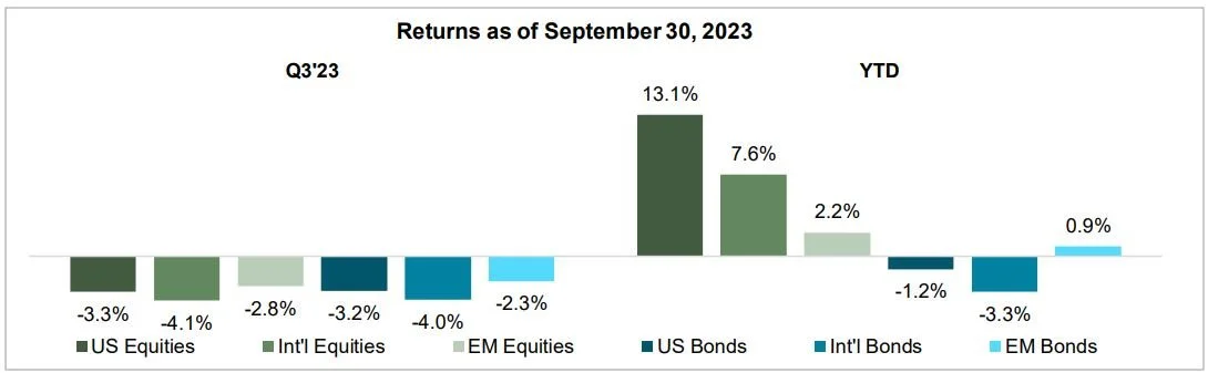 For the quarter, global markets were sent lower by rising interest rates and oil prices. Stocks and bonds fell as investors feared a resilient economy would lead to higher interest rates for longer. In US equities, we saw a reversal in trend among the narrow group of stocks nicknamed the “Magnificent Seven¹”. These stocks associated with the artificial intelligence boom had provided the market with most of its gains to date; however, the weight of higher interest rates sent them lower during the quarter. Zooming out, surprisingly, even amid concerns of a potential U.S. recession, the S&P 500 is still up 13.1% year-to-date.